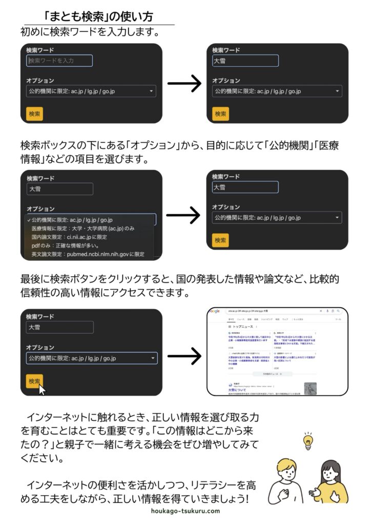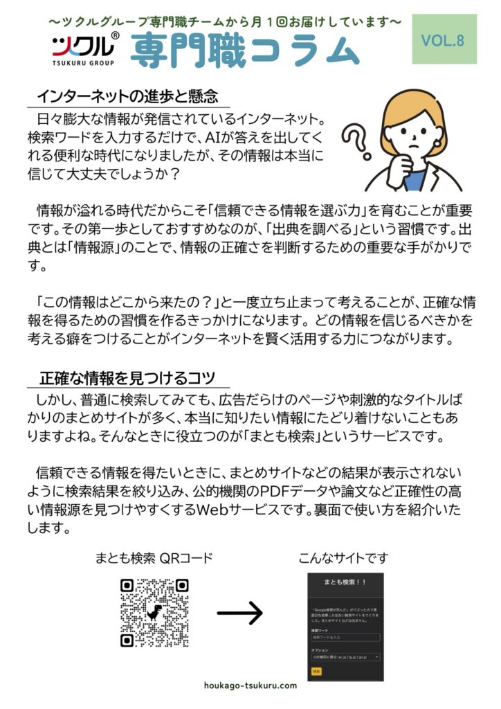 ホーム > 公表資料 > 専門職コラム > ネットリテラシー 〜正確な情報を探すコツ〜 ネットリテラシー 〜正確な情報を探すコツ〜 2025年2月27日 シェア ツイート シェア はてブ シェア ツクルグループ専門職チームから月1回お届けしています。 専門職コラムです。ご覧ください。 第8回は、情報が溢れるインターネットで「効率的に正確な情報を探す方法について」のコラムです!