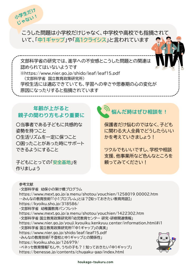 ホーム > 公表資料 > 専門職コラム > 小1プロブレムについて 小1プロブレムについて 2025年3月20日 シェア ツイート シェア はてブ シェア ツクルグループ専門職チームから月1回お届けしています。 専門職コラムです。どうぞご覧ください。 第9回は、もうすぐ進学の時期を迎えるということで「小1プロブレム」のコラムです!