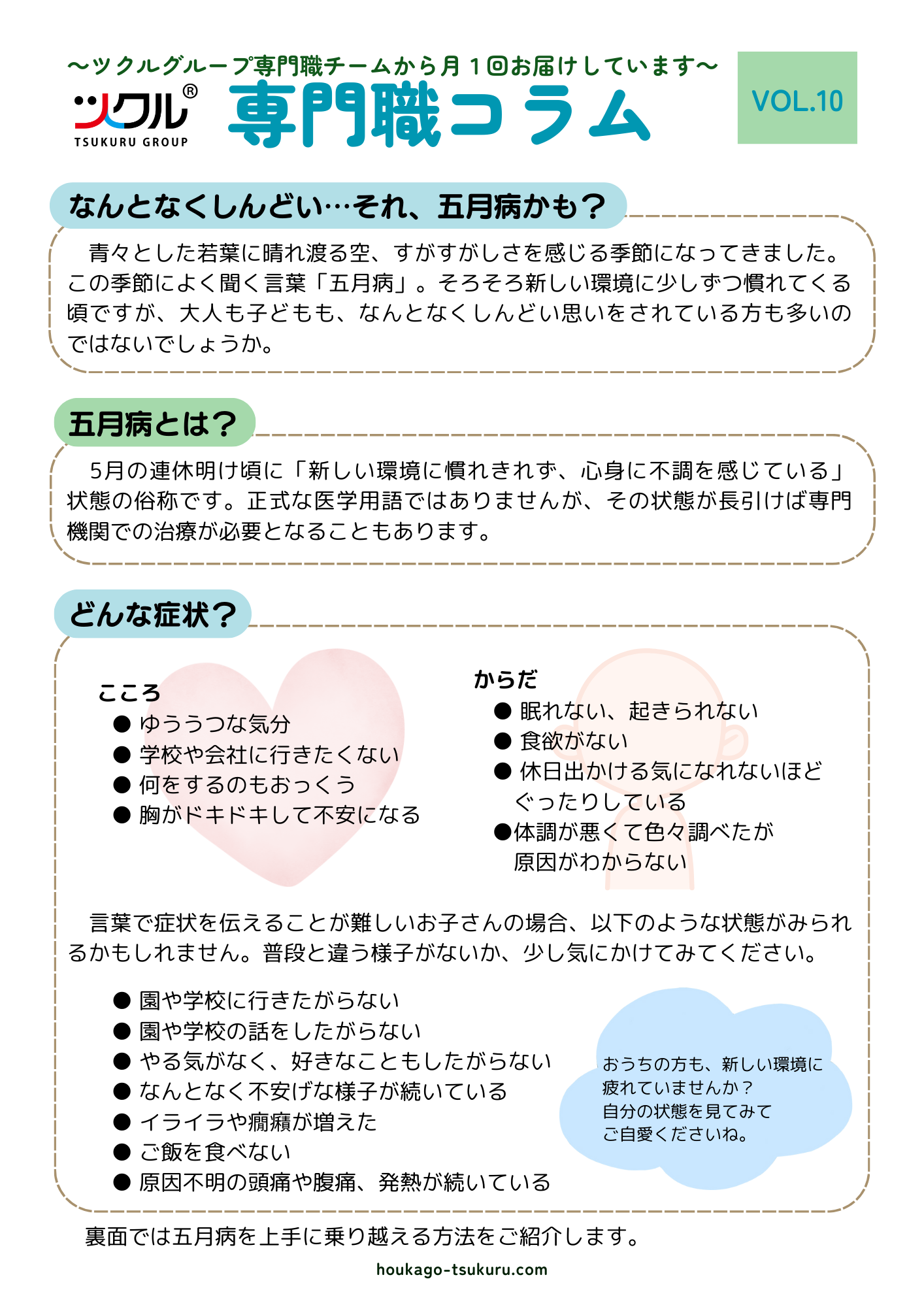 ホーム > 公表資料 > 専門職コラム > 五月病について 五月病について 2025年4月21日 シェア ツイート シェア はてブ シェア ツクルグループ専門職チームから月1回コラムをお届けしています。どうぞご覧ください。 第10回は、ゴールデンウィークが近くなってきた、この時期にまつわる「五月病」のお話です。