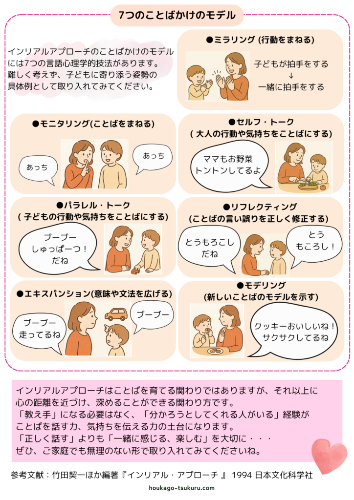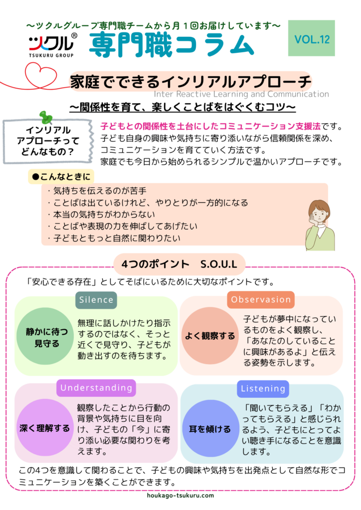 ホーム > 公表資料 > 専門職コラム > 家庭でできるインリアルアプローチ 家庭でできるインリアルアプローチ 2025年6月20日 シェア ツイート シェア はてブ シェア ツクルグループ専門職チームから月1回お届けしています。 専門職コラムです。どうぞご覧ください。 第12回は、ご家庭でも取り入れやすいインリアルアプローチについて言語聴覚士の視点からご紹介しています。