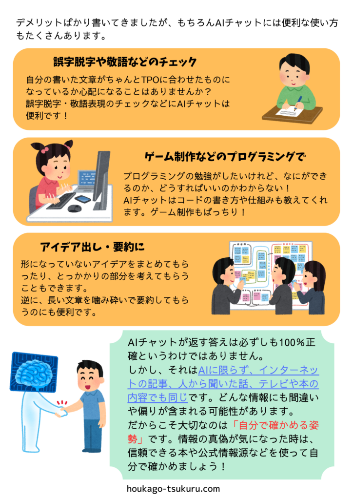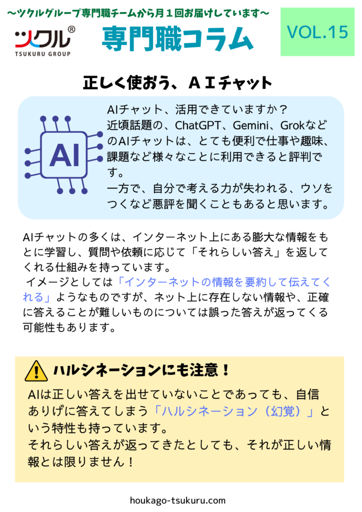 ホーム > 公表資料 > AIチャットについて AIチャットについて 2025年9月23日 シェア ツイート シェア はてブ シェア ツクルグループ専門職チームから月1回コラムをお届けしています。 第15回は近頃流行りのの「AIチャットについて」のコラムです。 どうぞご覧ください。