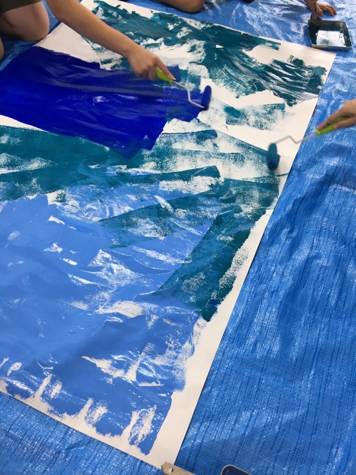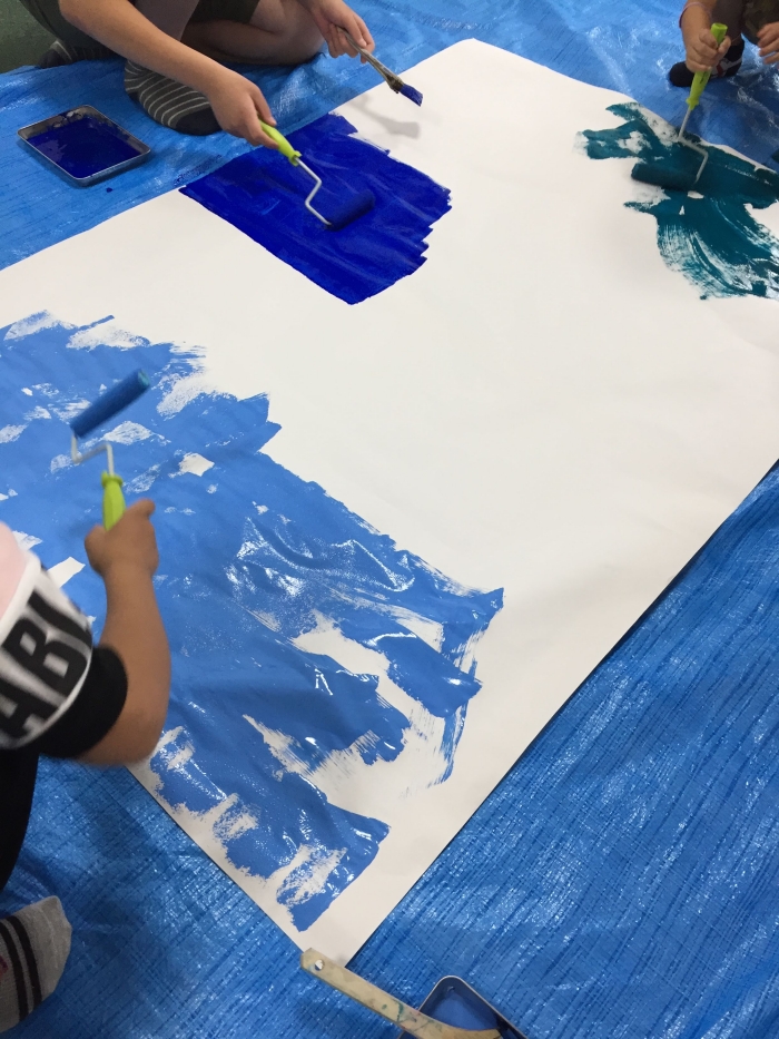 ローラーという道具を使い、みんなで協力して大きな紙一面を海の色に塗り上げました。青・緑・黒・黄色などの絵の具を混ぜ合わせ、単色ではない海の色を絶妙に表現しています。