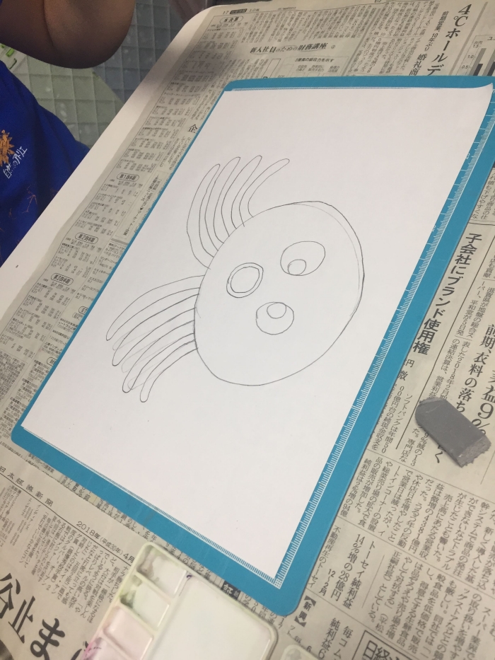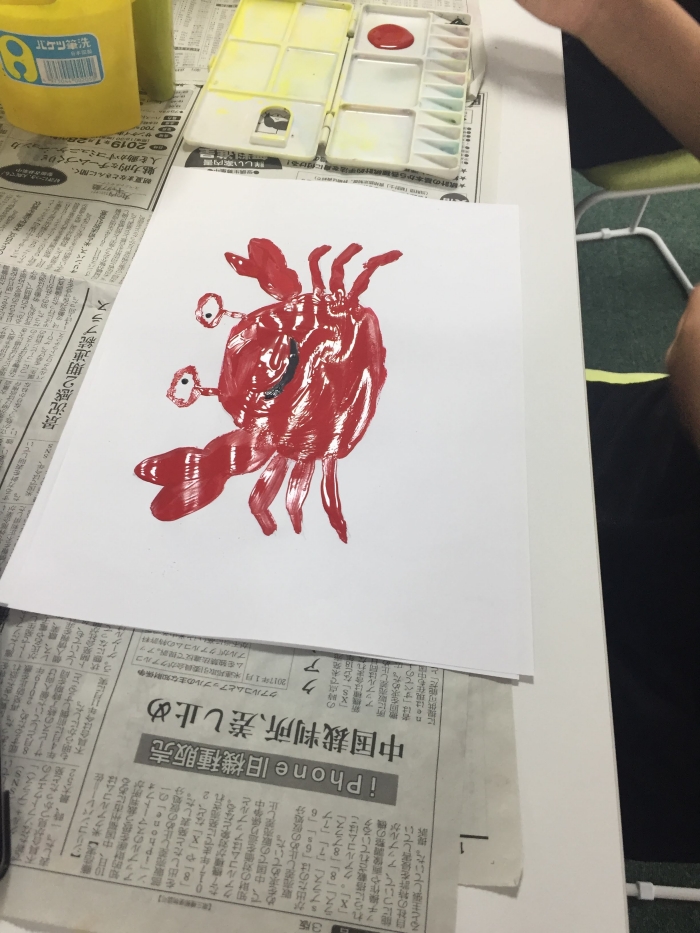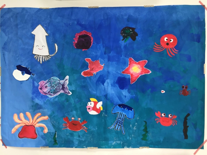 海の絵を乾かしている間に、それぞれ海の生き物を描きました。