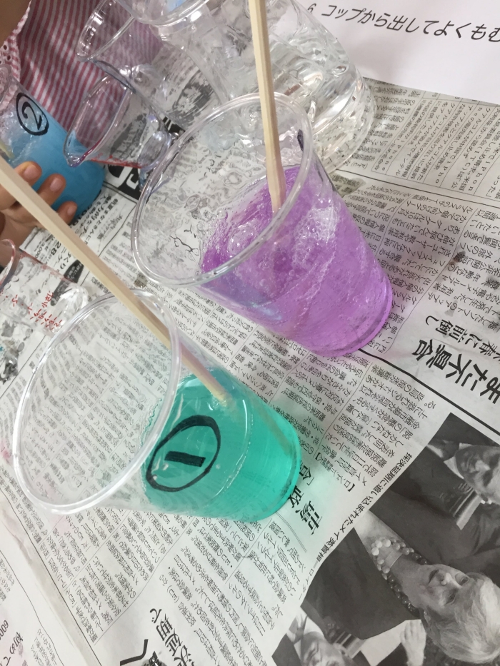 好きな色の色水を1人2色ずつ作り、洗濯のりを入れてしっかり混ぜ合わせます。そこにホウサ液を入れるとあっという間にドロドロになり、みんな不思議な化学反応に「わぁ〜」と驚いていました。