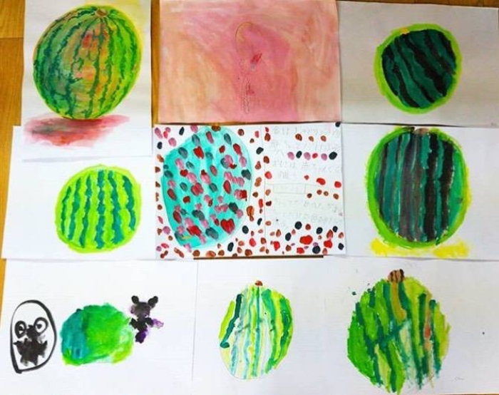 ★8/19お絵描きイベントは、丸いスイカを持ってみて重さ約かたちを体感してからデッサン。