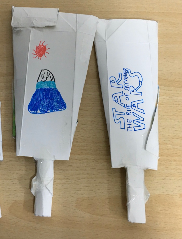 段ボールに色画用紙を貼り、白地の部分にイラストや願いごとを描いていきました。