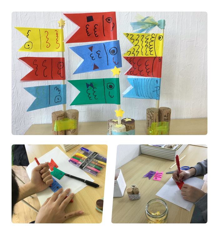 こいのぼり制作では、コルクや割り箸を使って立体のこいのぼりを作り進めました🎏