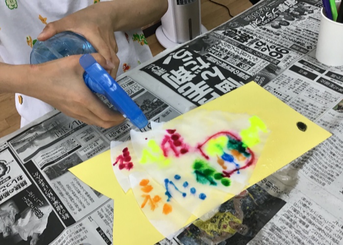 霧吹きで上からお水を‘シュッシュ”とかけ、ジュワーッと広がるカラフルなペン模様に