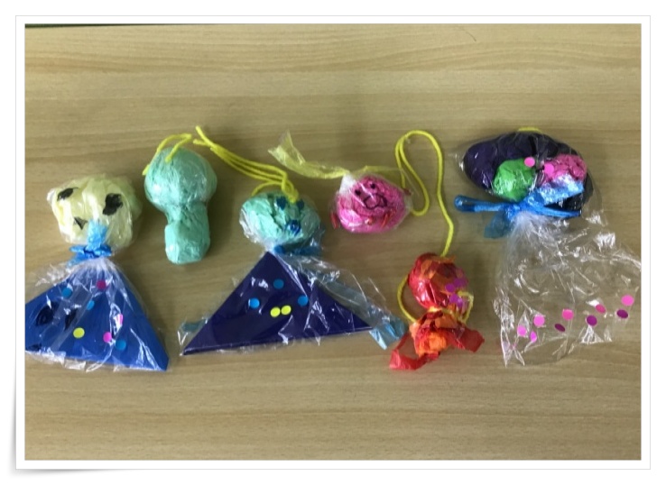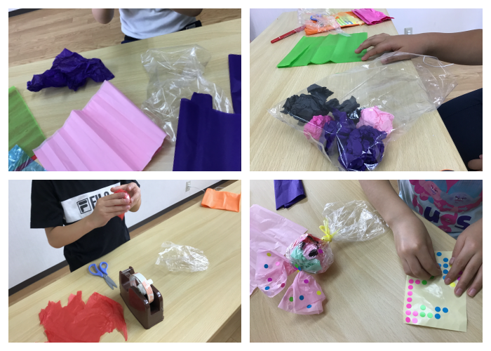 ビニール袋に好きな花紙を入れて顔を作り、シールやリボンを使ってアレンジ♩