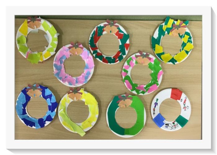 真っ白の紙皿に折り紙を貼り付けたり、ペンを使用して好きなイラストを描き進めました♩