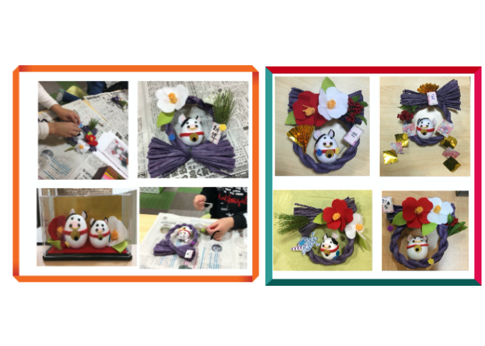 28日はお正月制作。卵型の発泡スチロールにフエルトを貼り、今年の干支である丑のオブジェを作りました。