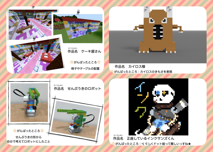 使用したソフトウェアは、マインクラフト、MagicaVoxel(3Dドットモデリング)、WeDe2.0(ロボット制作)、dotpict(ドット絵制作)です。それぞれに目標を決め、課題に取り組んでいます☺️