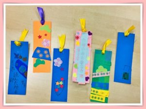”しおり作り”では、花やハートなど指先を上手に使いながら貼り付けたり、クリーパーや文字などのデザインを描いていました♪