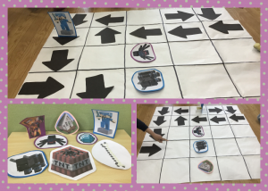 ”ゴールを目指して”では大きな模造紙にマス目があり、グループのお友だちと一緒にゴールまでのルートを考えて進むゲームです♪