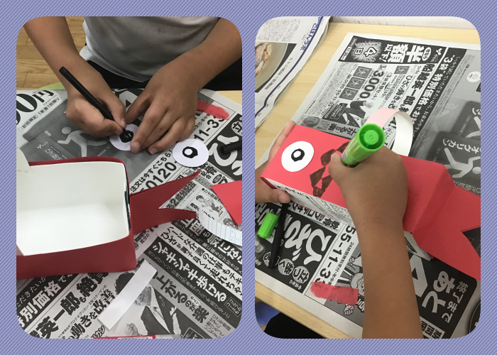 また、鱗を金色のキラキラ紙でデコレーションしたり、鯉のぼりの目玉をイメージしながら「可愛くしたいから前に目玉を並べてみよう!」と想像力が膨らんだ作品になりました♪