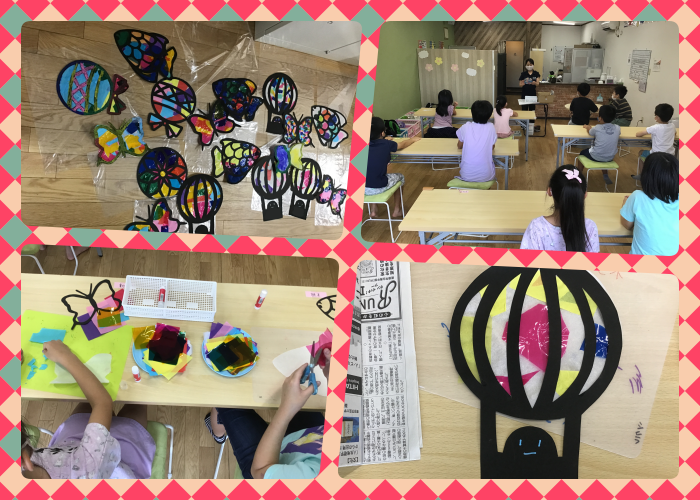 ステンドグラス作りでは、配色を考えたり貼り付ける角度等を先に考えて貼り合わせていく事で全体の出来上がった時のイメージ力の向上やちぎり作業を行うことで作業をする指(親指・人差し指)を上手く使えるようになるといったねらいを持って取り組みました。