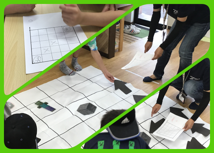 このプログラミング活動でも、どの道を通れば最短ルートでいけるのか・上のルートが良いか下のルートが良いか・何マスでいけるかなとみんなで数える等一つの課題に対し、テーマを持って話し合っていました。