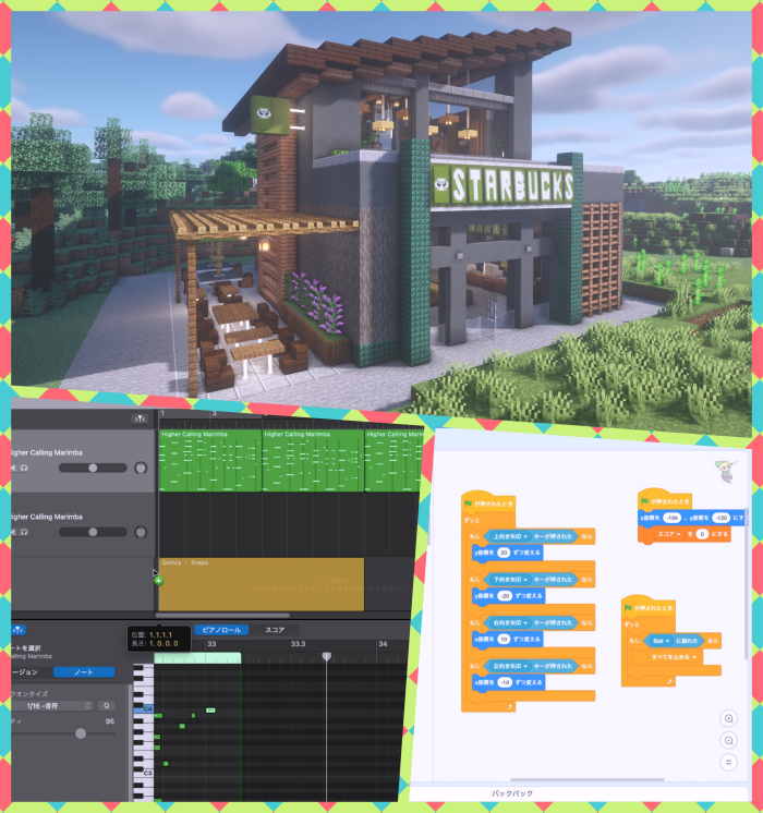 作品内容はマインクラフトの建築・装置・ドット絵、プログラミング・コーディング、3Dデザイン、CGデザイン、音楽制作など様々です♫