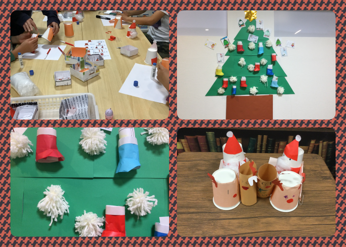 また、普段の活動ではクリスマスに向けての制作にも取り組みました。紙コップを使ったトナカイ やサンタさん、毛糸を使ったポンポンなどを作っています。みんなのメッセージを書いたカードも添えて、ミ・ナーラに素敵なツリーが登場しています🎄
