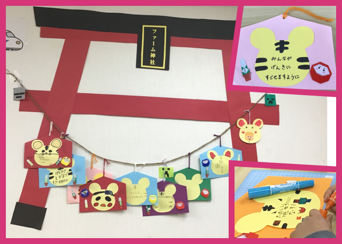 子ども達の思いの詰まった色とりどりの絵馬をファーム神社に奉納しました。