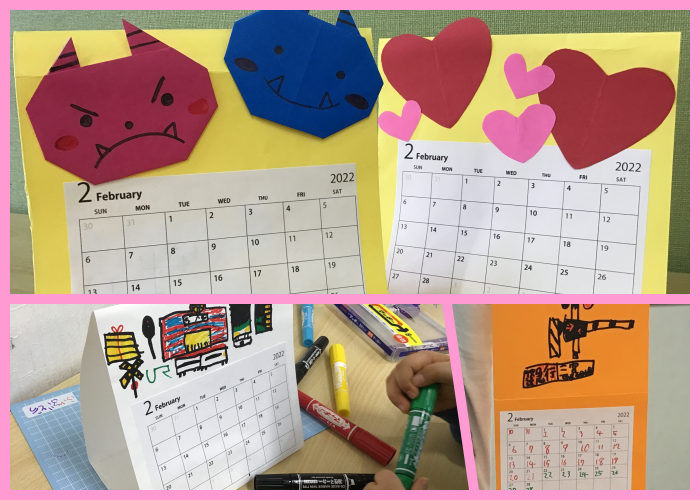 「2月といえば、節分だね」「バレンタインもあるよ」とお話ししながら、かわいい鬼の折り紙やハートの飾りを貼り付けたり、絵を描いたり、思い思いのカレンダーを作りました。