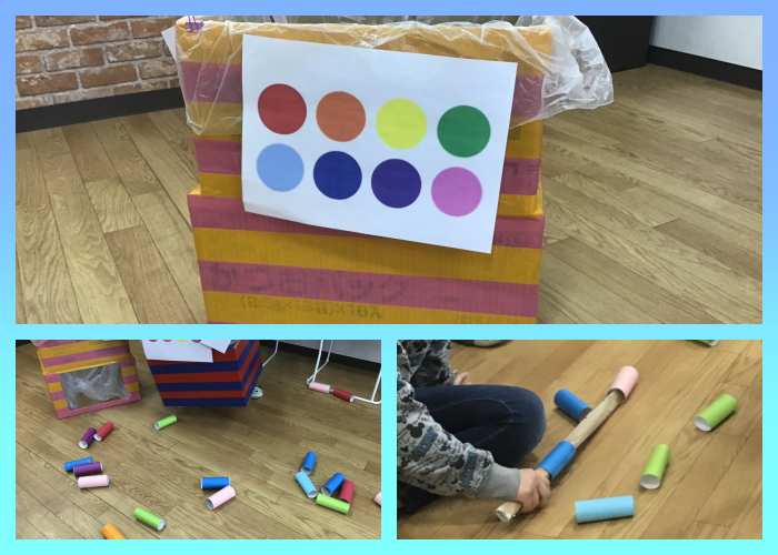 「暖かい色と寒い色に分けてください」と、出されたお題通りに新聞紙の棒で色筒をすくいあげて箱に入れました。「この色はどっち?」等と聞きながらワイワイ楽しく体を動かしました。