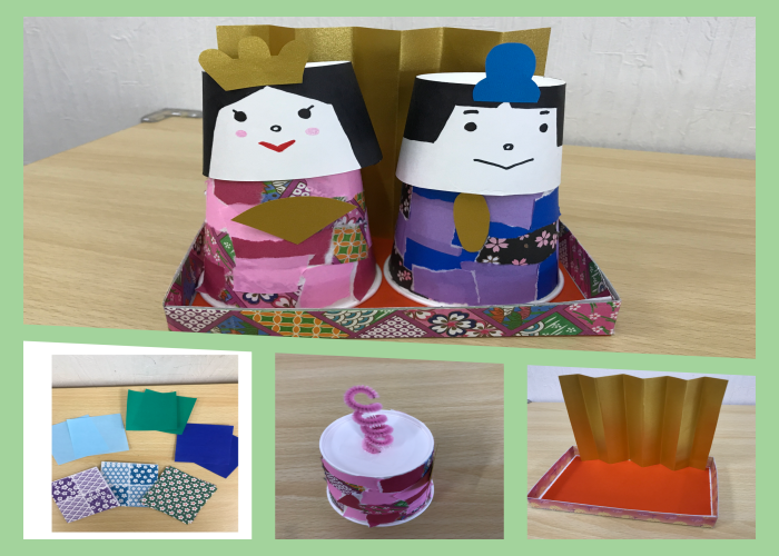 紙コップを使用し、折り紙や千代紙を貼り付けて着物を表現しました。