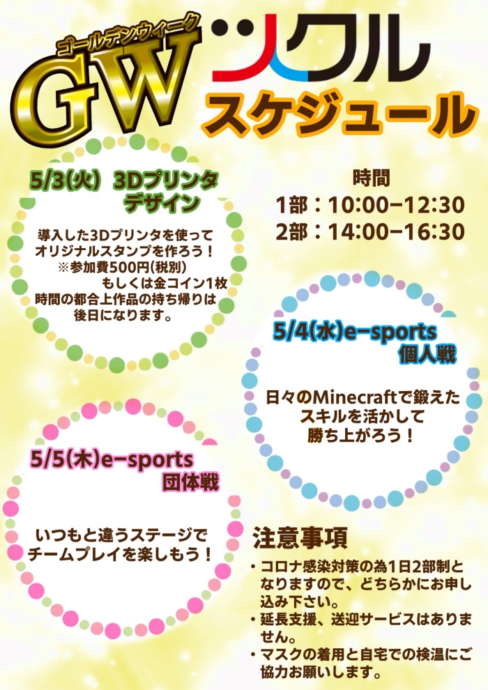 5月は3Dプリンターのイベントやe-sportsのイベントを開催予定です!