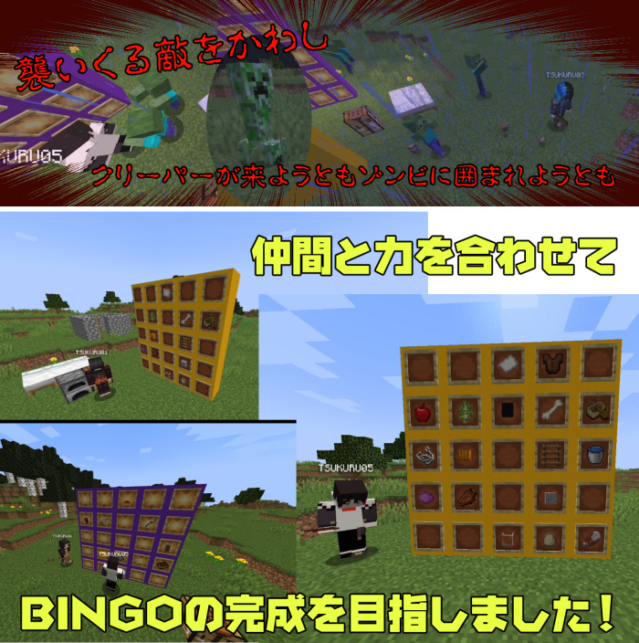 8月11日、待ちに待ったマイクラBINGOの日でした。グループに分かれてマイクラの素材を集めてBINGOを狙うというゲーム。グループの中には熟練の腕を持つ達人から最近マイクラを始めた初心者まで色々。時間制限がある中、必要な素材や素材集めに大切な拠点作りと作業分担をしながらBINGOに挑みました。最高3BINGOを揃えたグループもいて、ともに喜び合うことや達成感を感じることができました。また、友達と協働でBINGOの達成を目指し、交流を楽しみながら仲を深めることもできました。