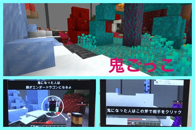・「鬼ごっこ」鬼になるとエンダードラゴンの顔になり、斧で相手をクリックすると鬼が交代します。子どもたちはすぐにルールを理解してプレイしています!様々なアイテムを手に入れ使用しながら、鬼になって楽しみ、逃げて楽しみ、「また、やりたい!!」と、とっても楽しんでいました。