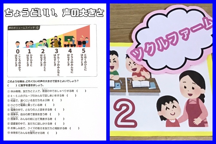 プリントの問題をみんなで考えて、時と場面での声の大きさを考えました。