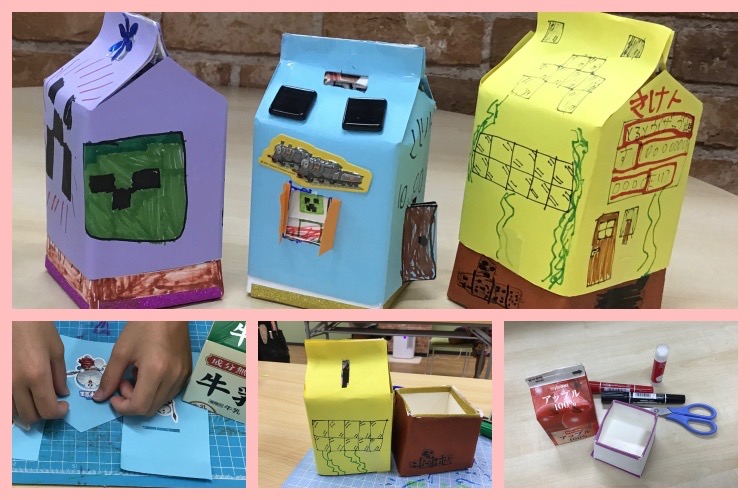 牛乳パックを半分にカットし色画用紙でコーティングして貯金箱を作りました。「お金の入口はどこにしようかな?」と考えて、飾りはペン・色鉛筆・色紙を貼る・シールを貼りたい!同じ材料を使っても仕上がりは個性溢れるオリジナルが完成!!みんな楽しく創作し達成感いっぱいの笑顔を見せてくれました。