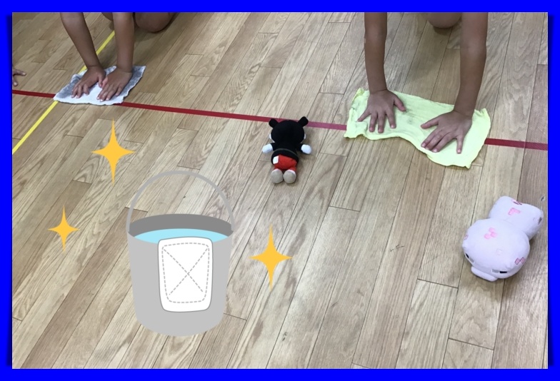 しっかり雑巾を絞って元気にフロアを雑巾掛けしました。障害物に当たらないようにしながら元気に運動しましたよ!フロアもピカピカにキレイにしてくれました。