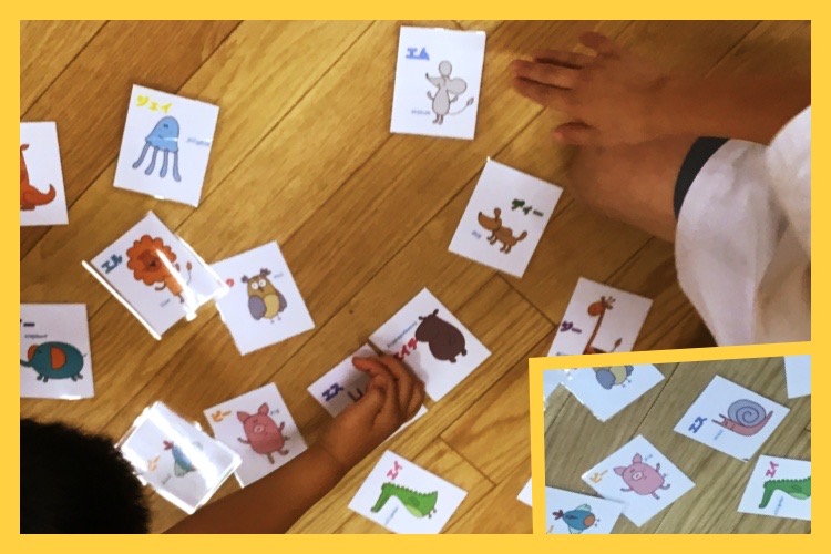 読み上げられるローマ字を探してカードを取りましたよ!「ハイ」と元気に声を出してカルタにタッチ。