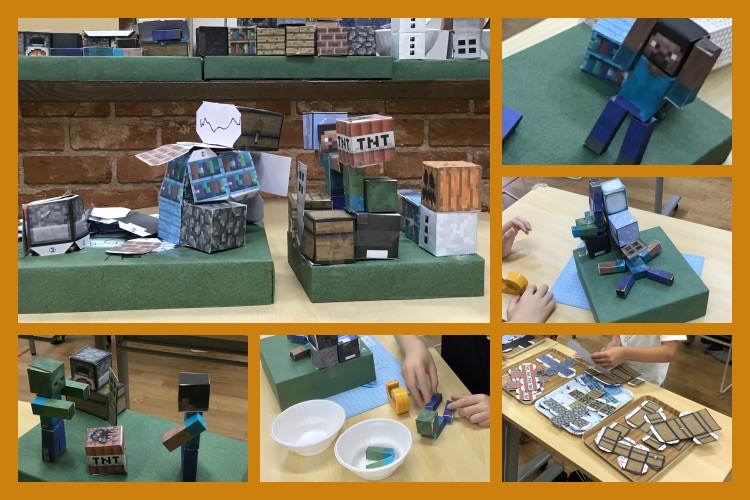 ペーパークラフトでマインクラフトのワールドを作りました。一枚の用紙から工夫して立体を作ることを体験しイメージを形にすることを楽しんでいました。スティーブやゾンビ、TNTや様々なブロックを作ってアイデアを膨らませています。チェストの蓋があくように工夫したり、同じ素材を使っても様々に個性あふれる作品を完成させて達成感いっぱいの子ども達でした。