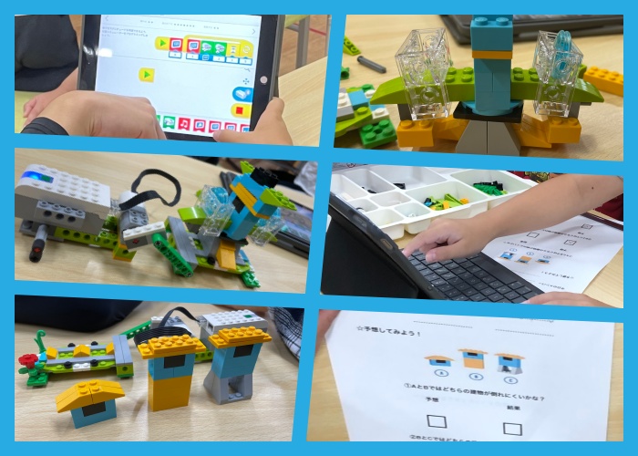 頑丈な構造物はどんなかたちだろう?とチームで予想しながらロボットを作り、プログラミングを組んで動かしています。3パターンの建物にぶつけて、どの建物が一番頑丈か実験しました。結果と理由を考えています。また、オリジナルの構造物を作って試してみるチームも!!それぞれの意見を出し合って、楽しみながら頑丈な作りを体感していました。