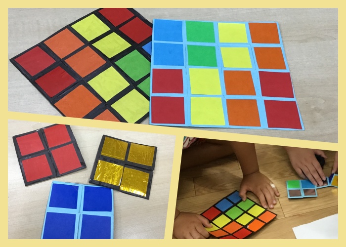 様々な色が並ぶ用紙から同じ色を4枚並べて正方形の形を作りました。試行錯誤をしながら真剣な表情で考えていました。「出来たよー!!」と完成した際には満面の笑顔をみせてくれました。