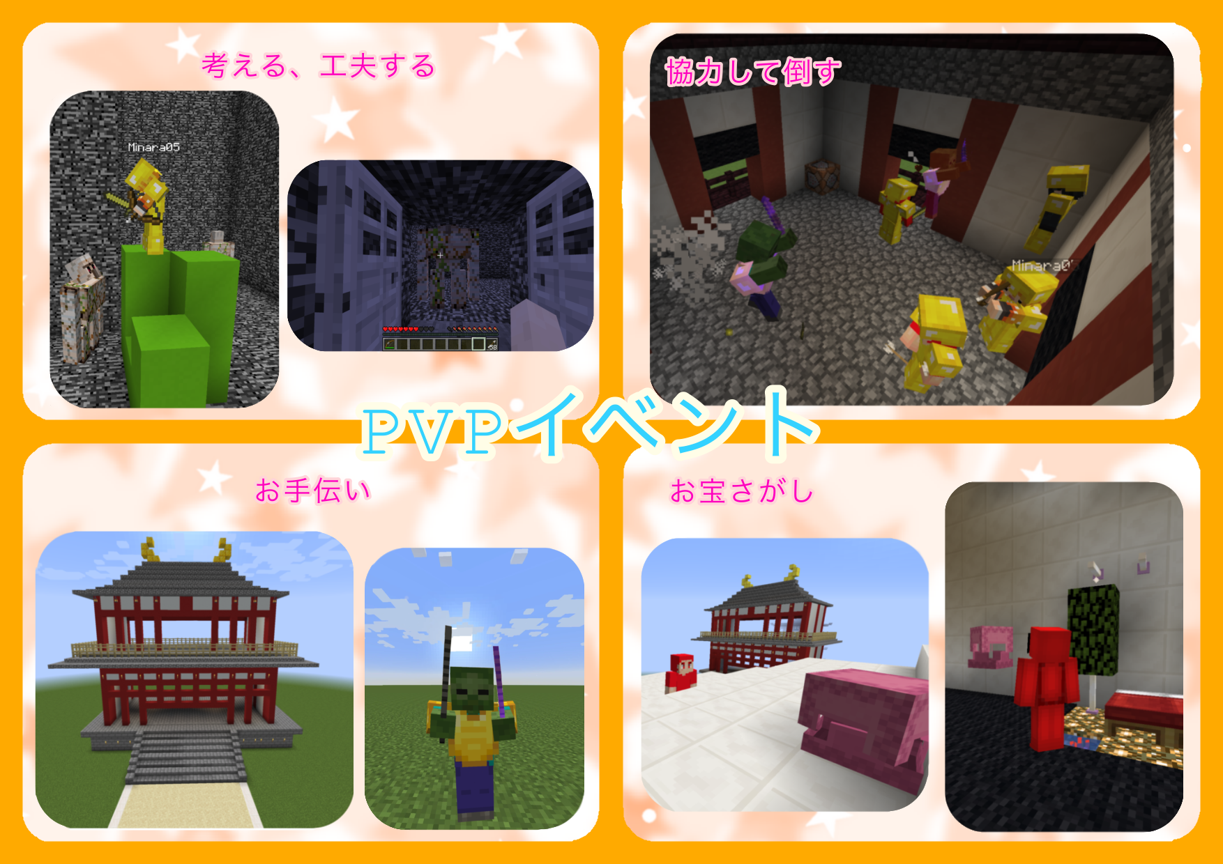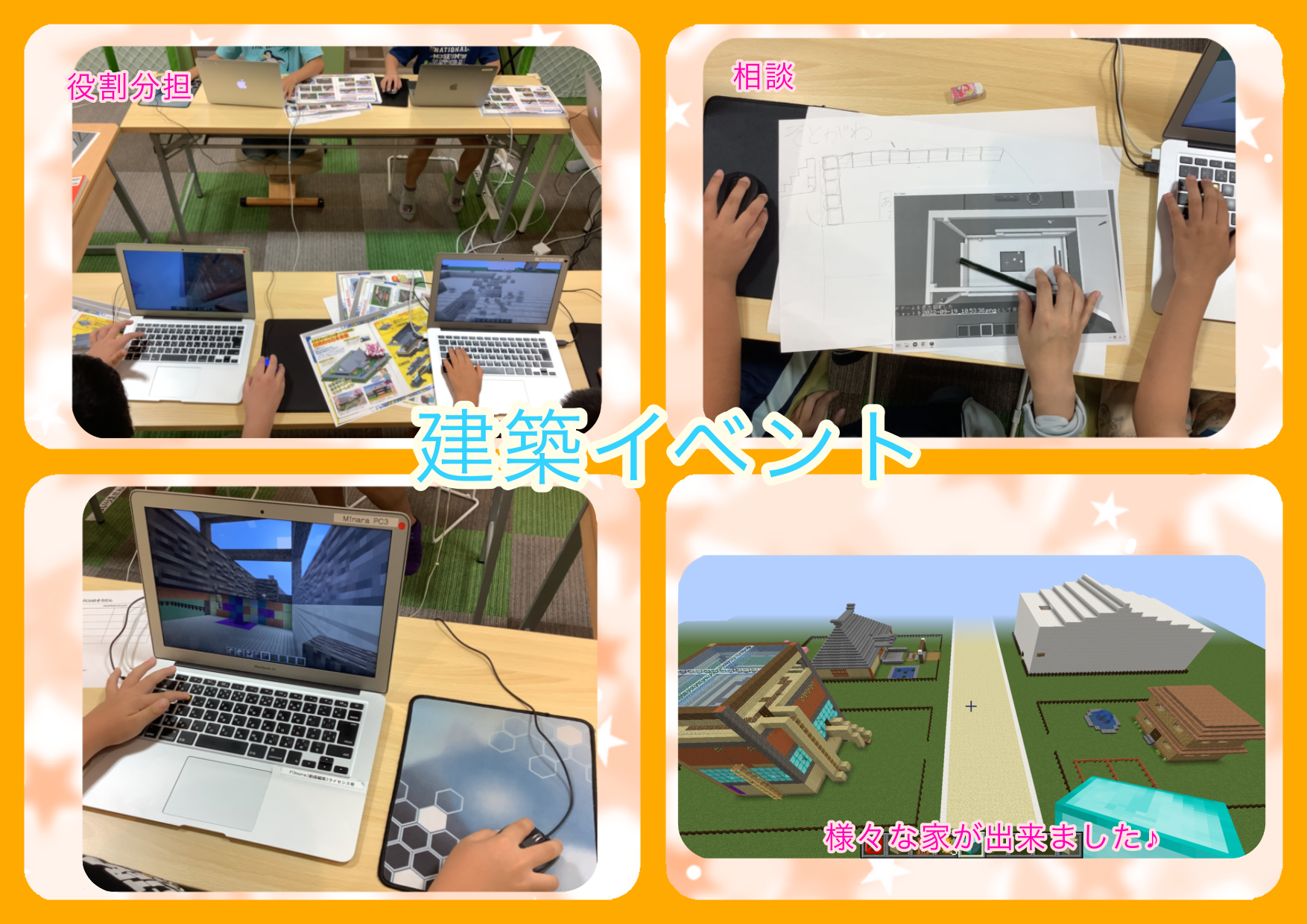 建築イベントとPVPイベントの両方に参加してくれるお友達もおり、「これは僕が作った!!」と他のお友達に自慢げに話をする姿が見られることもありました。「これどうやって作ってるんだろう?」とお友達が作った建築やMOBに対して興味をもつ姿も見られており、中にはお友達に作り方をお手紙で聞く子もいました。初めて関わりをもつ子が多い中で、子どもたち同士でコミュニケーションをとり仲良くなる姿が見られるなど子どもたちの成長を感じる素敵なイベントになりました✨