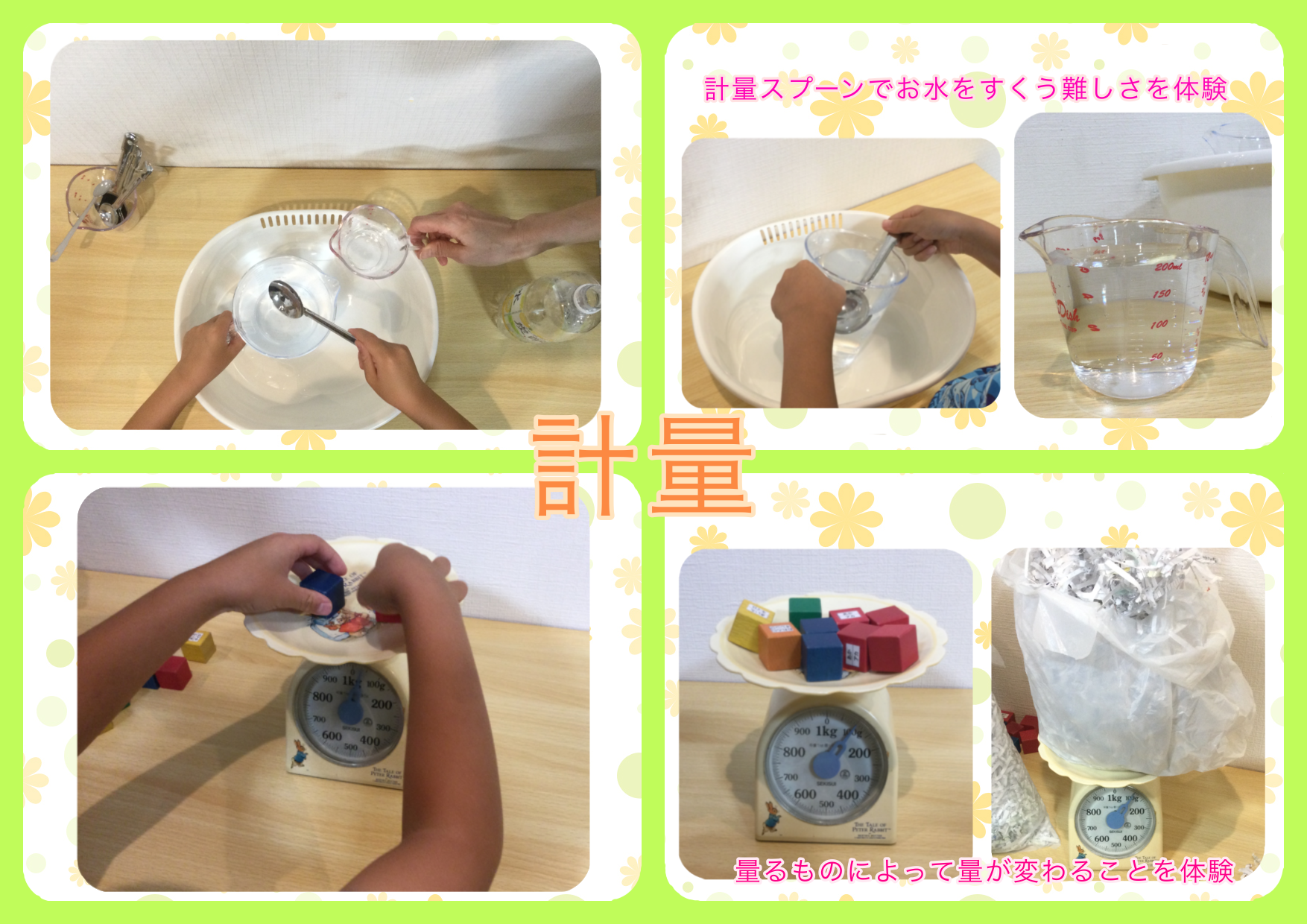 計量では、1Lを計量カップや牛乳パック、ペットボトルではかったり、ブロックと紙を100グラムになるように測ったりと同じ重さでも物によって質量が違うということを楽しく学びました✨