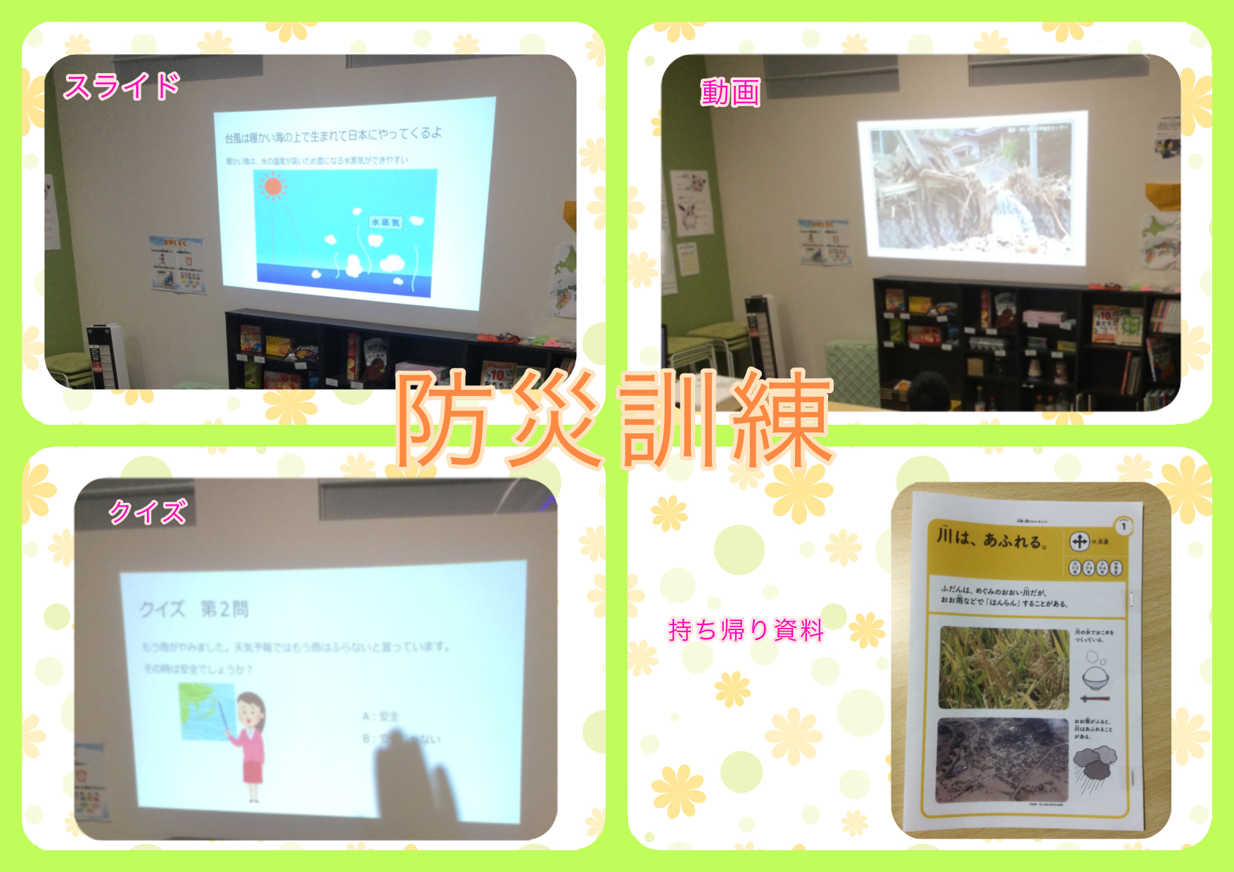 今回の防災訓練は、台風についてのスライドや動画を見たりクイズに取り組んだりしました✨