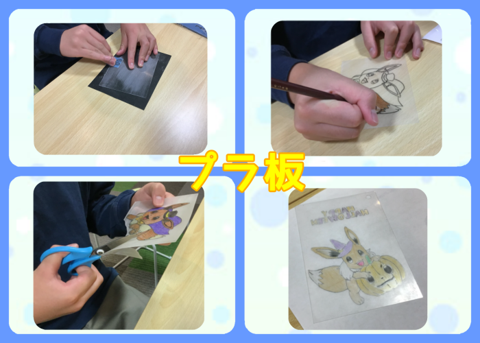 色鉛筆で描けるように自分達でプラ板にヤスリをかけ自分の好きな画像をなぞってイラストを描き色を塗りました。