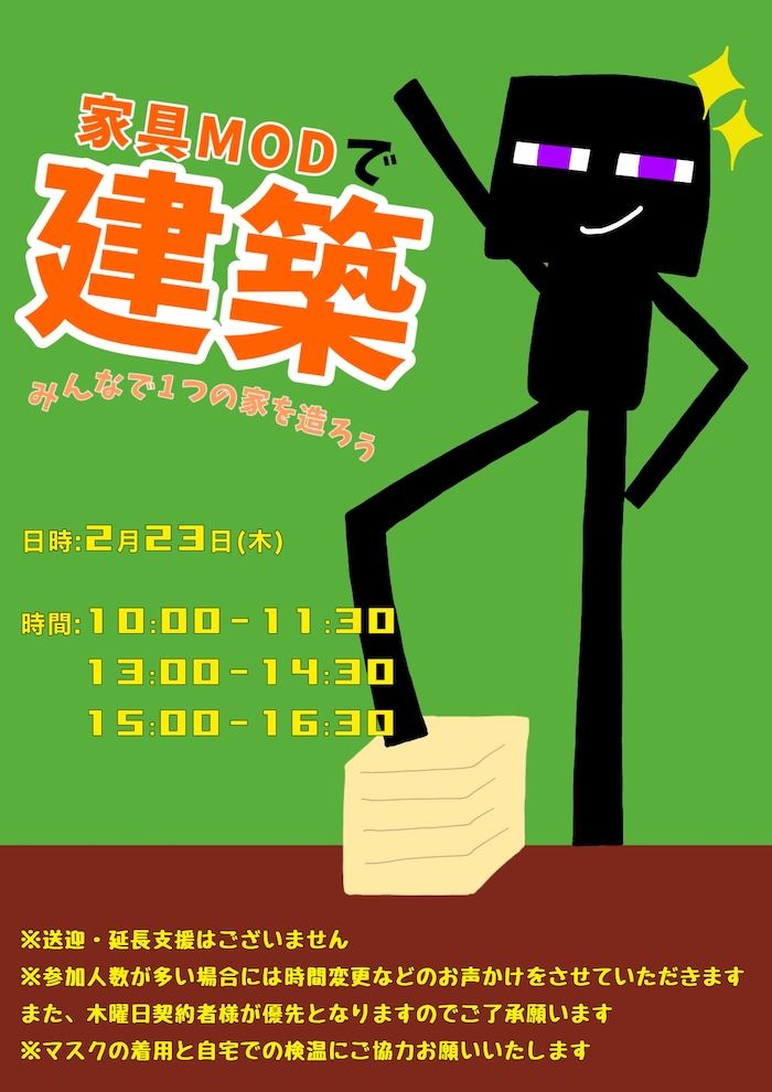 2/23(木・祝)はマインクラフトの建築イベントを行います!