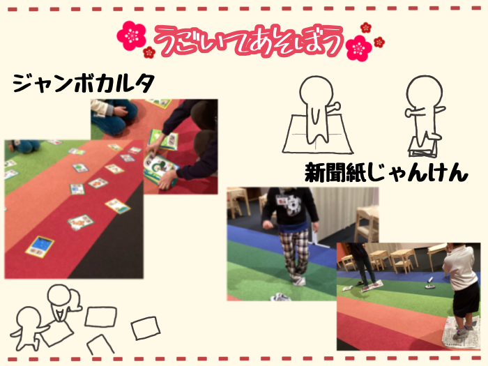 お正月遊びといえば…カルタ?!ということで、普段遊ぶものよりも大きな「ジャンボカルタ」に挑戦しました。ひらがなに興味を持ち、大きく全身を動かすことをねらいとしています。札が大きい分見る範囲も広く、見つからない時は札の間をウロウロ…「座っててもできるよ」と余裕そうにしている子どももいましたが、先に札を取りたい一心で遠くにある札にダッシュして行く姿もあり、12月の活動「聞き方名人」を思い出しながらよく耳を澄ませて頑張っていました。