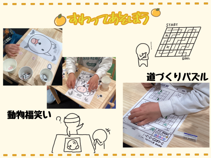 カルタに続き「お正月といえば…」の遊び2つ目です。季節の遊びを楽しむことや手先の巧緻性を高めることをねらいとしています。顔をきれいに作りたくてちらっと薄目を開けて見る子もいれば、豪快にぐちゃぐちゃの顔を作り大笑いしている子もいて、取り組み方にも個性が出ています☺︎ゲームを楽しんだ後は、目を開けた状態で顔のパーツの配置を考えたり、わざとパーツをたくさん置いてみたりしながら、想像力を膨らませて色々な顔を作り楽しんでいました。