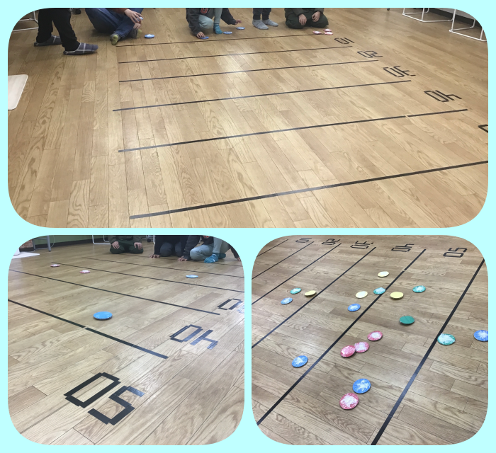 滑らせすぎないよう高得点地点を目指していました。勢いが強すぎて場外に出てしまったり、力を抜きすぎてほとんど滑らなかったり。最後に点数を数えるのも楽しみにしていたお友だちが多かったです。