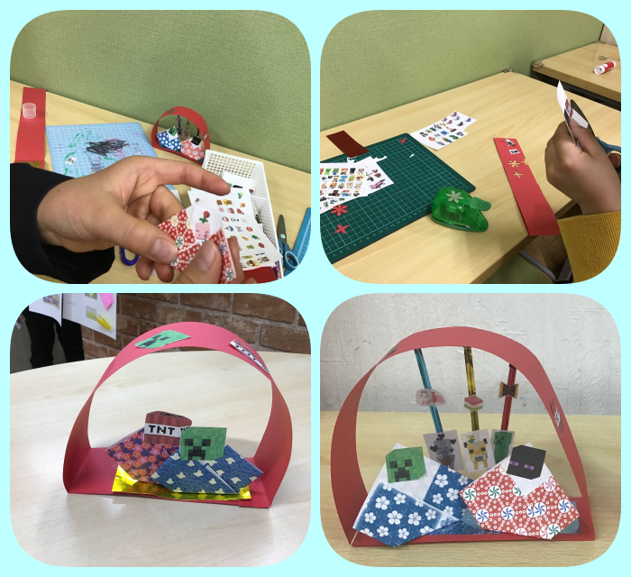 見本をみて「お雛様を自分で折りたい」と折り紙を選んだり、「みてみて、こんなお雛様にしたよ」と大好きなマイクラのMobの顔をお雛様とお内裏様にするお友だちもいました。