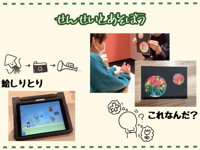 文字への興味関心を高めることをねらいに、アプリで絵しりとりをしています。ルールを知らないという子には、スタッフが一緒に取り組みました。「いか…か…」と最後の文字から始まる言葉はどれか、選択肢から選んで進めていきます。見慣れない物が出てきた時には「これなに?」とスタッフに尋ねたり、選択肢の中から明らかに異なるものを除いて消去法で答えを選んだ後に「こんな名前なんだ」と確認したりして、自分の力で考えて解いていました。
