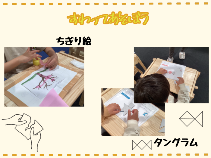桜の綺麗な時期だったので、ちぎり絵で桜の製作をしました。糊の使い方を知ることや手先の巧緻性を高めることを目的としています。糊の使い方については、「中指で糊を塗ると、親指や人差し指がベタベタせず使いやすくなる」ことを説明しました。慣れるまでは少し塗りにくいですが、覚えておくといろんな製作の際に役立ちます。スタッフの説明通り、中指を使いながらちぎった紙に糊を塗り、貼り付けていきました。大きくちぎった方が木をすぐに埋められると思ったのか、折り紙や花紙をとってもとっても大きくちぎって貼る姿もあり…思い思いの桜の木を咲かせていました