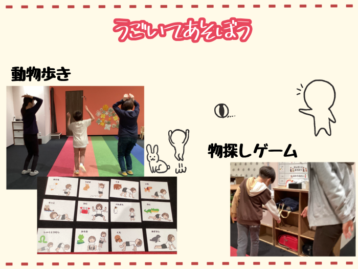 体幹を鍛えることをねらいに、色々な動物の歩き方をまねっこしました。動物のイラストが描かれたカードを1枚引き、その通りにまねっこをして部屋を往復するルールです。普段、日常生活の中ですることの少ない動きのためすぐに疲れてしまい「難しい〜」とそのまま地面にへたりこむ姿もありましたが、スタッフが同じ動きで「先生の方が早いかもしれないな〜」と追いかけていくと負けじと体を動かしています☺︎興味津々で、1種類の真似が終わるとすぐさま次のカードを引き、スタッフが用意した12種類の動物全て行うほどでした!色々な体の動かし方をすることができました♪