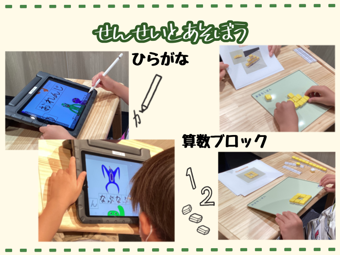 ICTツールや文字に興味を持つことを狙いに、iPadのお絵描きアプリを使用してひらがなを描きました。題材は、子どもたちの興味のあるキャラクターの名前にしています。「このやつ好きやで」「家でこのゲームしてる」と楽しみを持ちながら取り組むことができました。お絵描きアプリの使い方もすぐに理解して、自分の書きやすい文字の大きさに拡大したり、間違えて書いた線はバックで1つ前に戻したり…スムーズに使いこなしていました。自分のペースで丁寧に書き、完成したものを印刷して渡すとみんな満足げな笑顔でした。